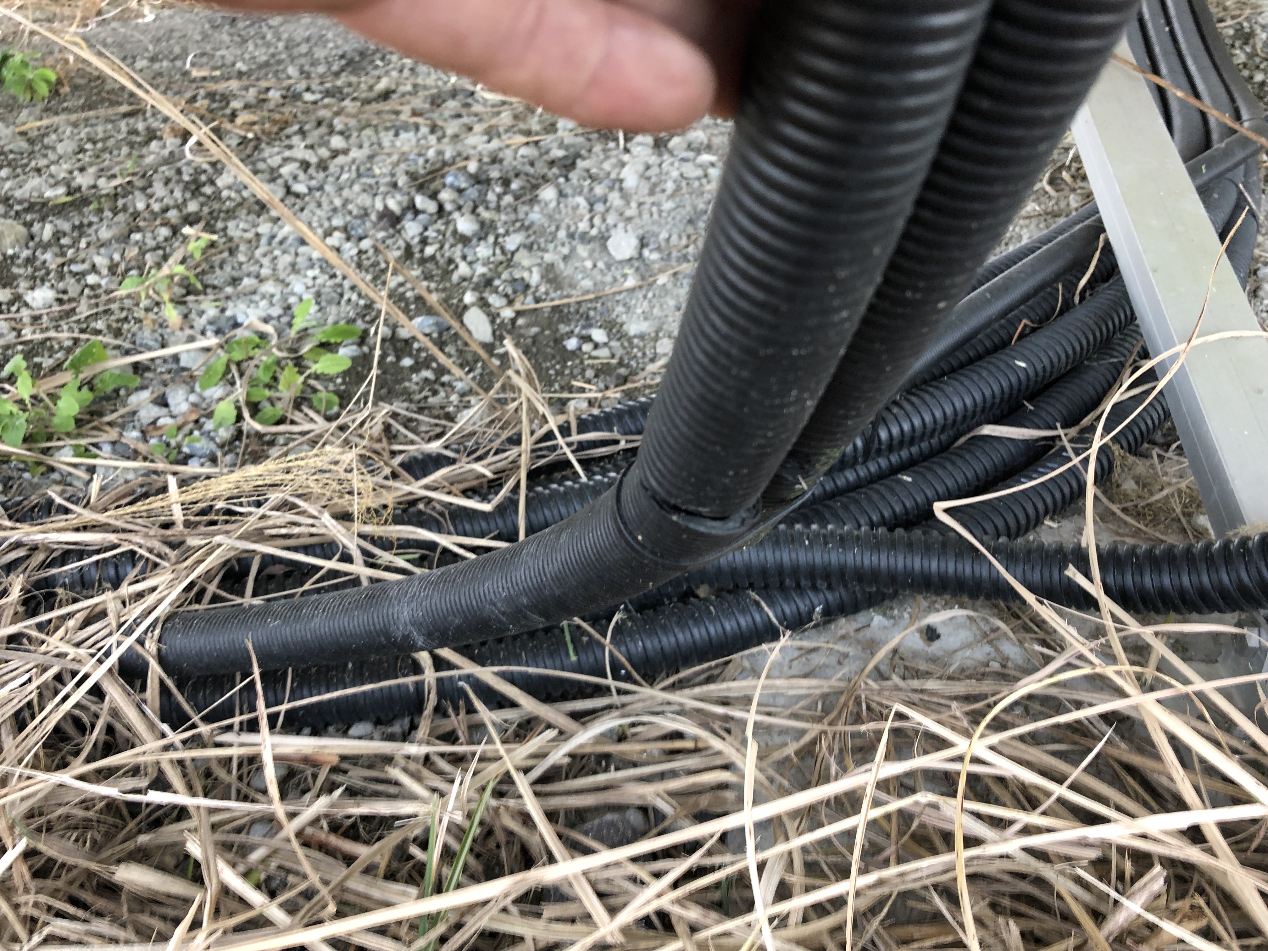 下写真は今回の点検でケーブル保護管の切断箇所を発見したものです。(私が切ったわけではありません!)幸い内部のケーブルは生きていました。