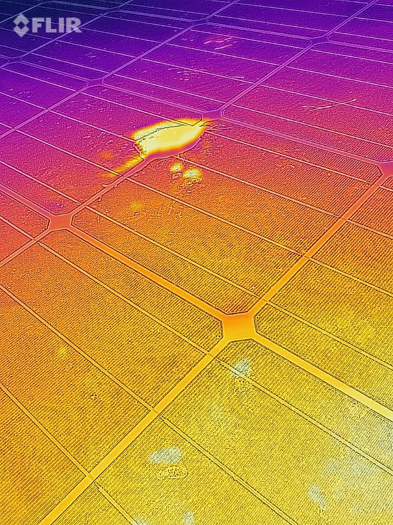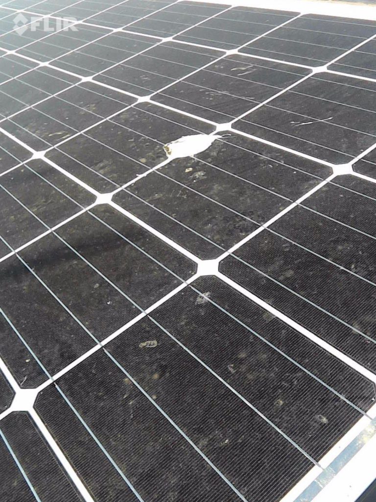 千葉県市原市の点検現場での写真を共有します。当社では最近携帯用のサーモカメラを活用し、端子台の確認や、ホットスポットの確認を行うケースがございます。下記のように大きな鳥糞のようなものや固定化された影があると、その部分の電気抵抗が高まり部分的に発熱します。これをそのまま放置しておくと焼損に繋がり、さらに放置すると火災などに発展する危険性もあります。従って、モジュール洗浄もしくは簡易でも清掃を定期的に行うことが必要になると考えます。